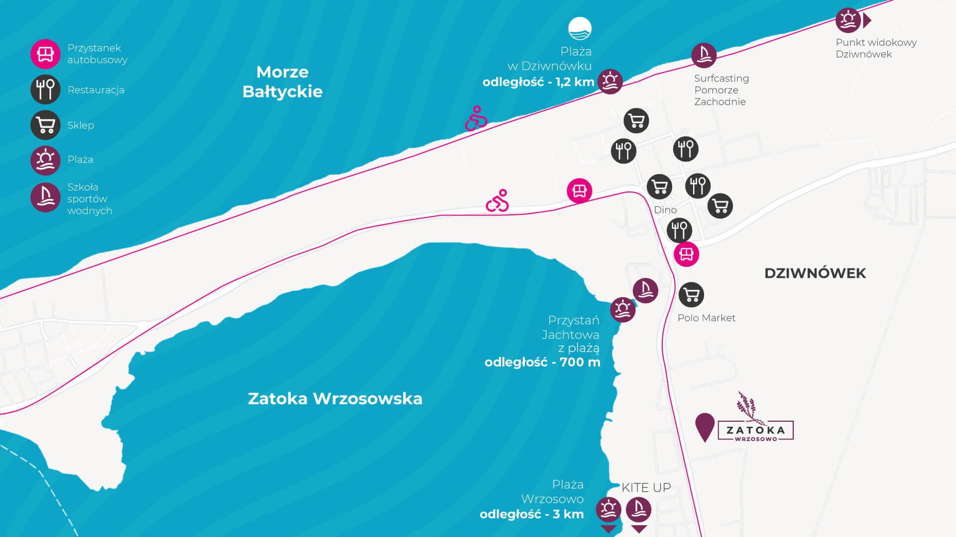 Inwestycja zostanie zrealizowana w Dziwnówku, zaledwie 1,2 km od szerokiej i piaszczystej plaży posiadającej niebieską flagę. Dodatkową atrakcją lokalizacji jest bliskie sąsiedztwo z malowniczą zatoką, gdzie znajduje się Przystań Jachtowa Dziwnówek z wypożyczalnią sprzętu wodnego.